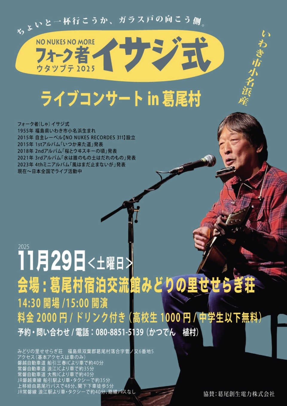 11月29日(土)葛尾村宿泊交流館みどりの里せせらぎ荘で、フォーク者イサジ式さんのライブが開催されます。